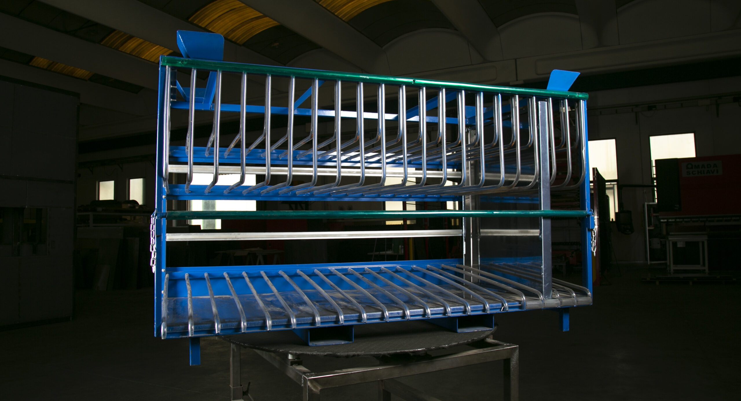 Precedentemente le gabbie di trasporto erano composte da divisori in lamiera. L’attuale gabbia presenta divisori costituiti da tondini di ferro piegati e assemblati mediante saldatura al traverso. I tondini sono ricoperti da un tubo in PVC trasparente mentre il fondo della struttura presenta una lastra di policarbonato: soluzioni che garantiscono che le componenti inserite non si danneggino a causa di colpi e sfrisi durante la fase di caricamento che di trasporto. Per la stessa ragione le gabbie sono state dotate di paracolpi e sponde rimovibili. L’insieme di tali soluzioni non solo garantisce la protezione dei prodotti trasportati, ma ha permesso di alleggerire la struttura di circa 30 kg a beneficio del trasporto e dell’ambiente.